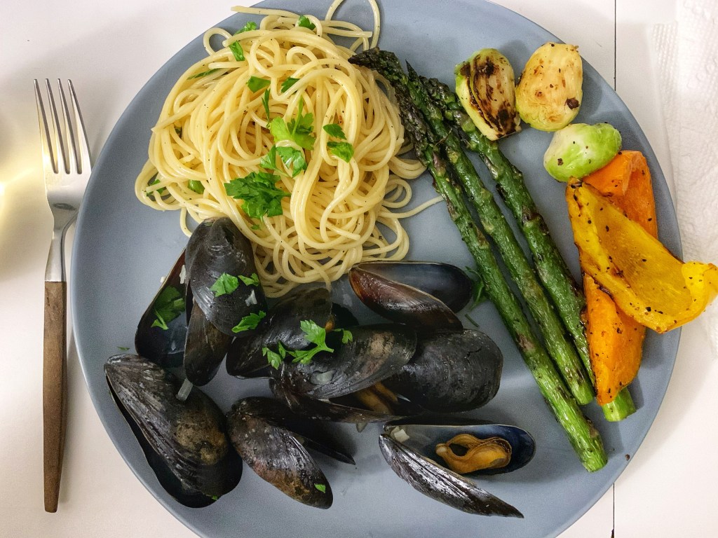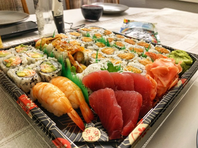 - June: Homemade – mussels, pasta, grilled veggies. Takeout – Omakase Yume.