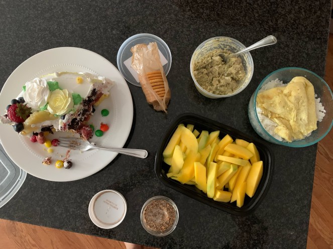 Other: parathas, dumplings, Stan’s – glazed and chocolate old fashion, birthday cake, mangos, Culver’s – butterburger, chicken khao poon (made by my brother’s friend), HyVee – cake (carrot, chocolate, caramel, red velvet), Good Earth – chicken salad sandwich & chips, D’Fruta – mangonada