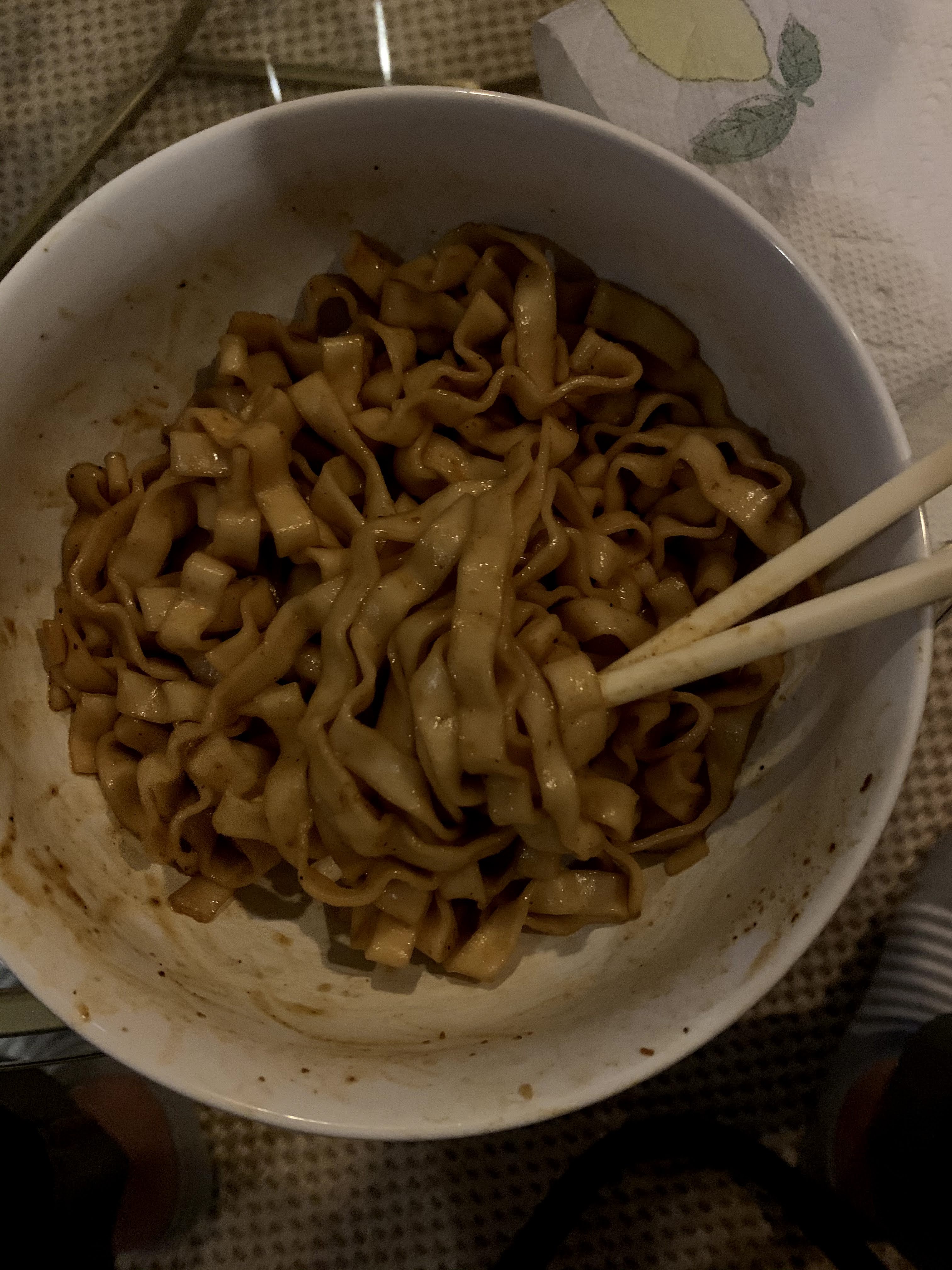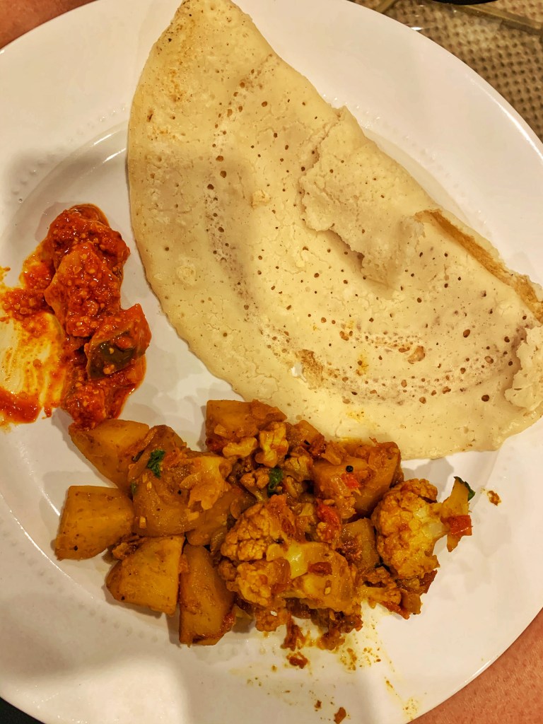 Homemade: khichdi (Indian breakfast tapioca), misal, salmon wonton noodle soup, vegan-ish banh cuon (Vietnamese rice crepes), Maggi (instat noodles), chai, subsi, fried oysters, spicy instant noodles, pancakes, sour shrimp noodle soup, dosas with chutney, crab legs, salt and pepper tofu, dan dan noodles, instant noodles fancied up, black lentil pilaf with fried mackarel