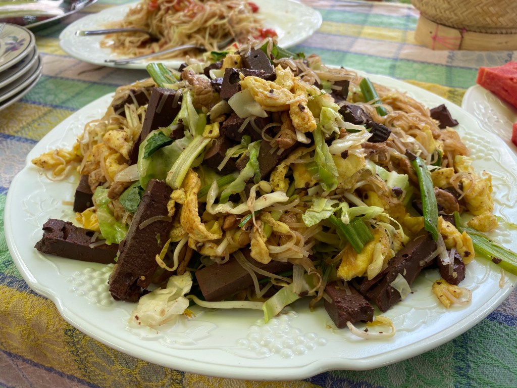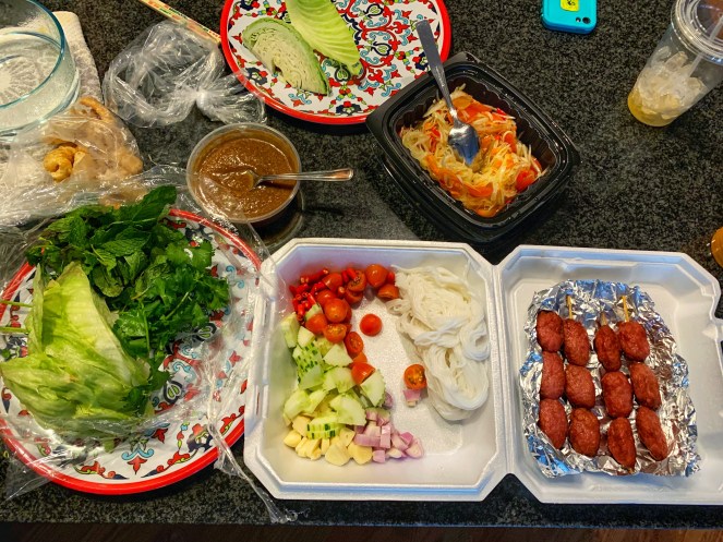 Homemade: instant noodles with spinach, shrimp and aspargus, spicy sugar snaps,crab legs, tum khao poon, grilled wings, khao piak sein, sour shrimp noodle soup with spinach and cabbage, spicy tuna mayo onigiri, salmon onigiri, Lao BBQ with seen naam thok, grilled wings and jeow som, sunflower crunch salad, kuaw mee, papaya salad, BBQ ribs, mac and cheese (with Velveeta), mashed sweet potatoes
