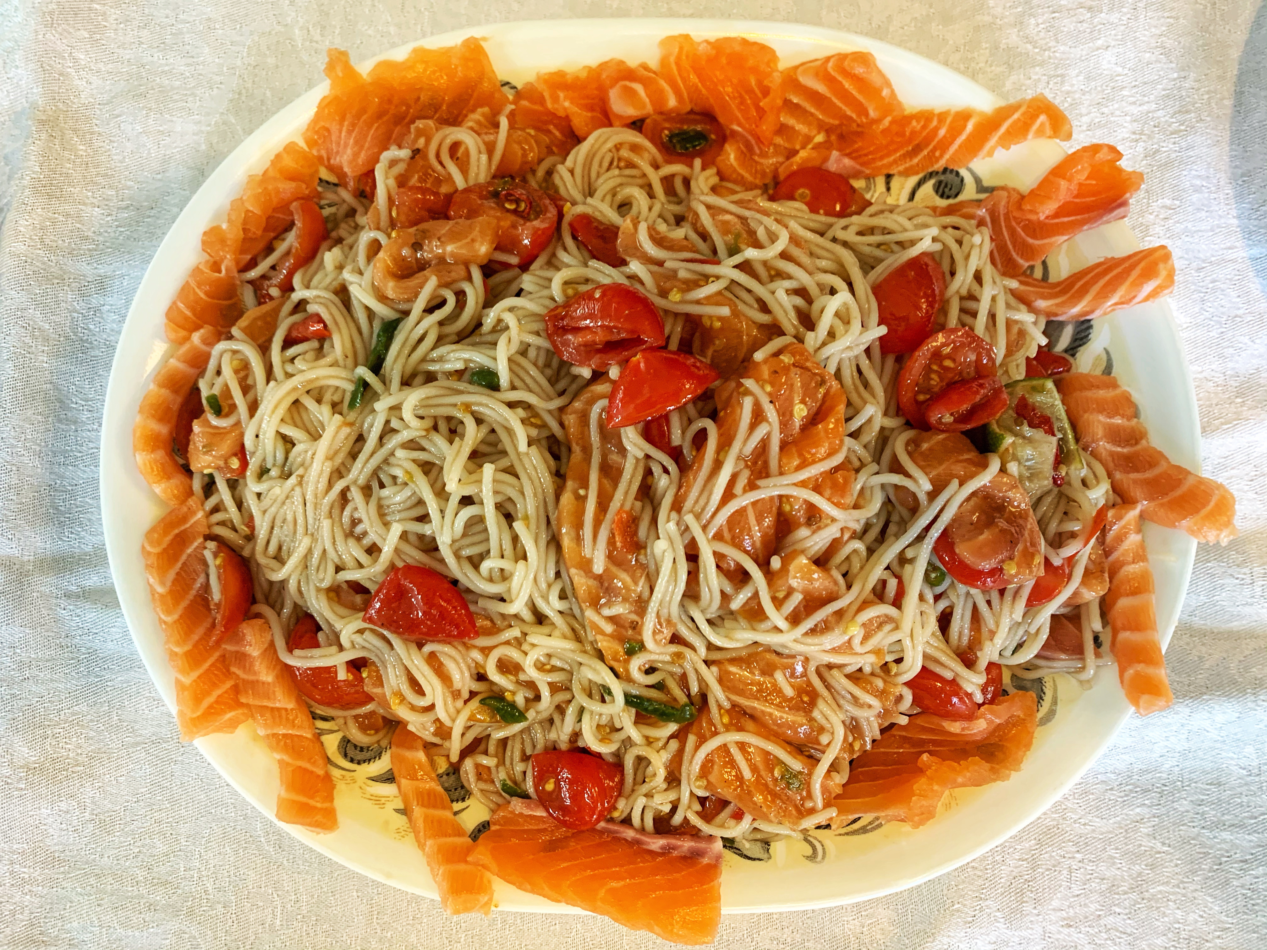 I was over at my cousin’s house for some homecooked goodness. She had made some salmon noodle salad (otherwise known as tum salmon), steak (seen naam tok) and her mom, my aunt, had made some dessert (naam vahn).