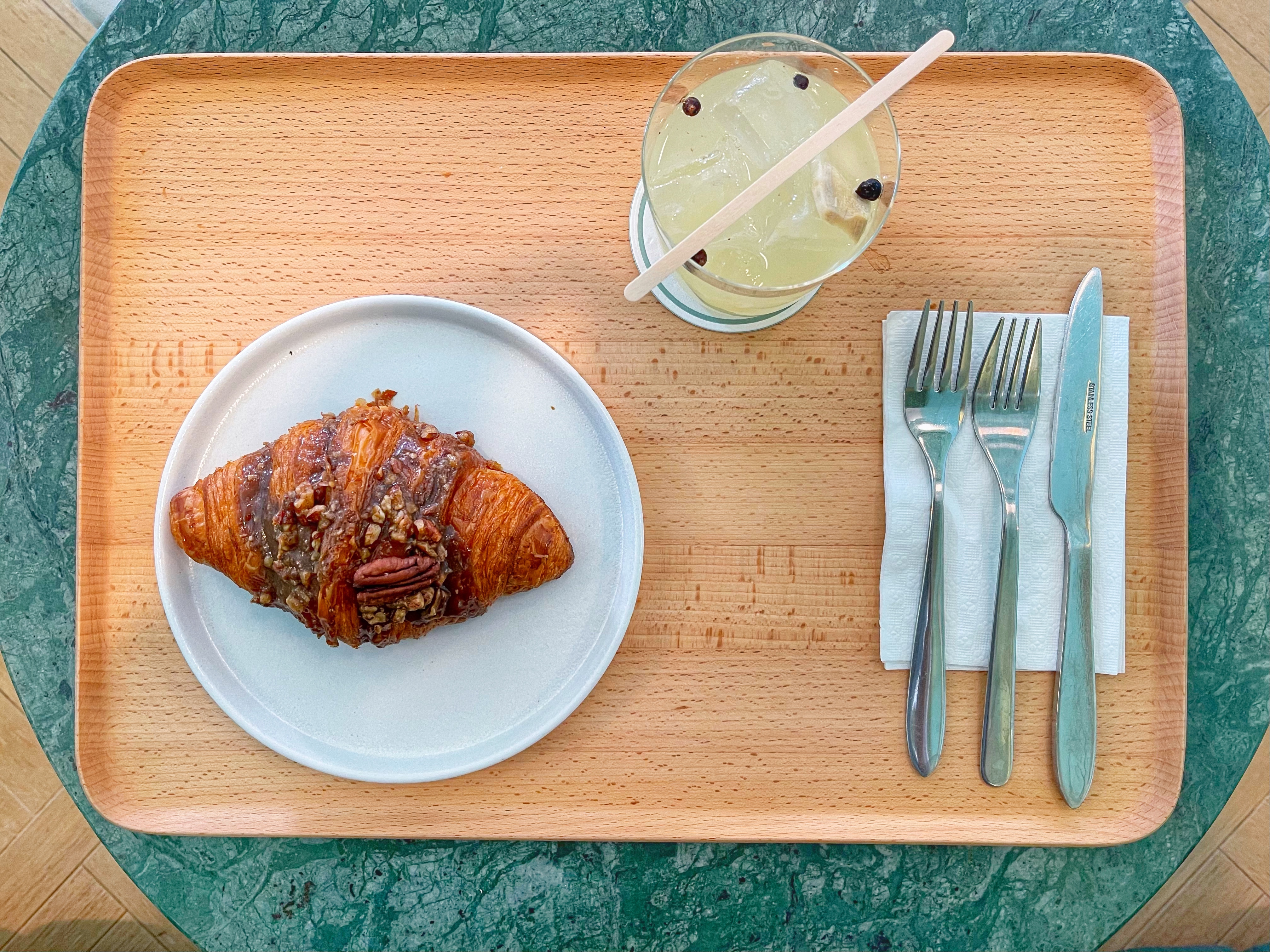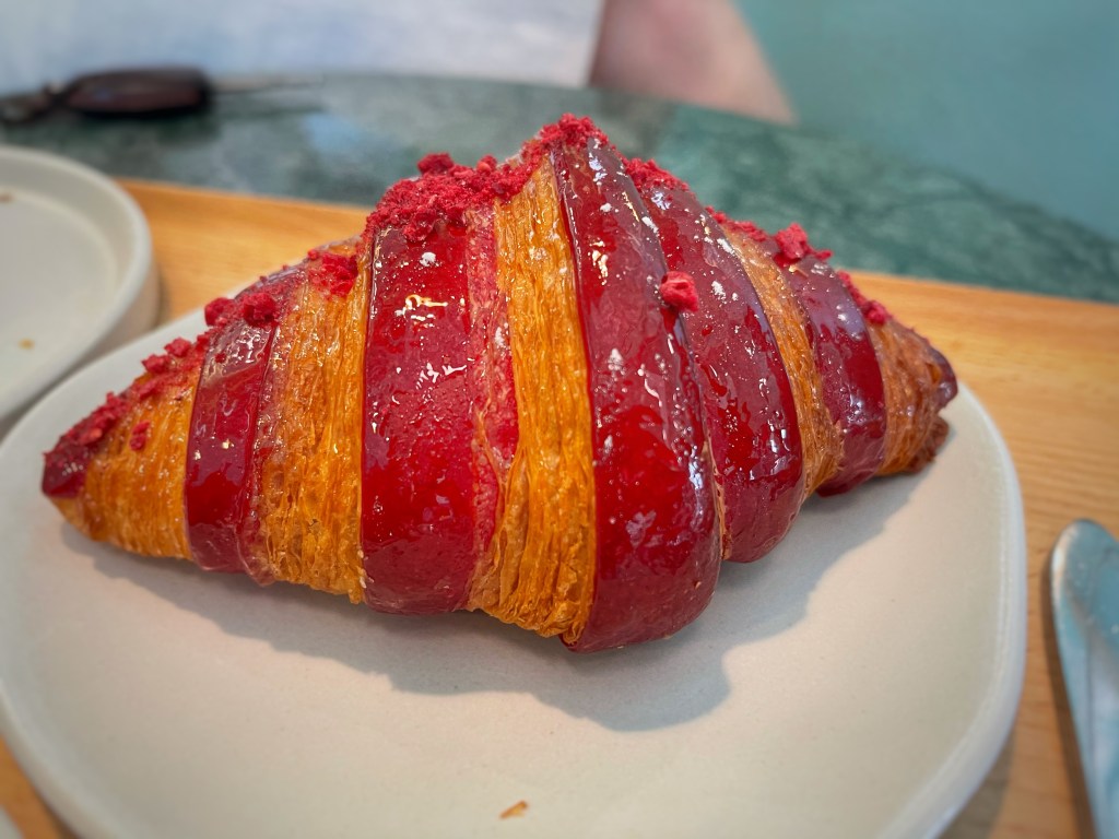 The flavors I’ve tried: raspberry, lemon meringue, ham & cheese, black truffle and almond. And after, literally, popping over to try and get a plain one (I the midst of writing this post) I have a favorite…and I still didn’t get a plain one. I’m skeptical if they make a plain one. The place had only been open for 30 minutes when I went there this morning…there’s no way they sold out (it was also fairly empty inside). So, let’s talk about these croissants and the two drinks I tried.