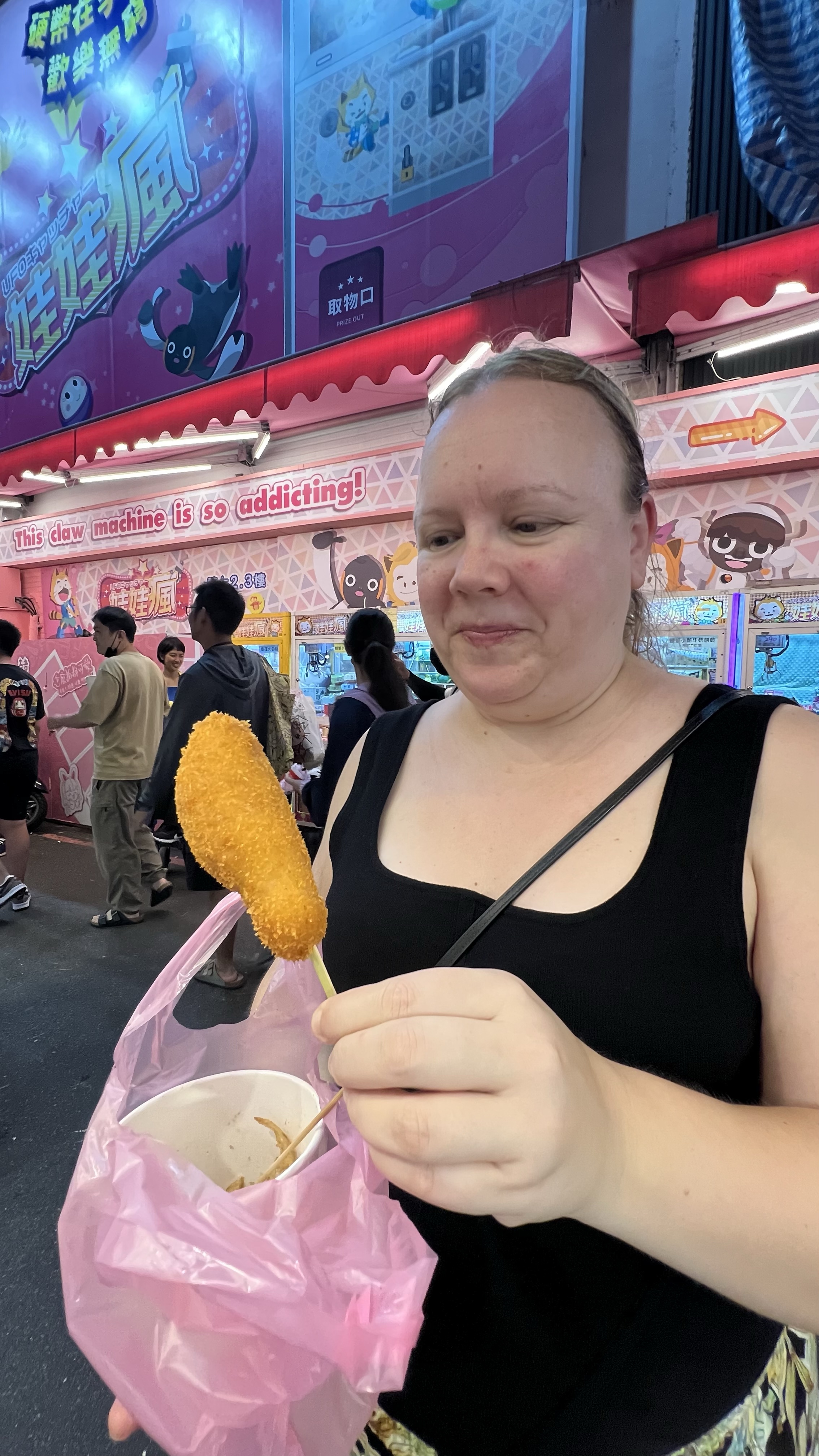 A Ximendieng, I got fried chicken and Anne got fried mushrooms. We wanted about and got more food. A cheese “hot dog” for Anne (it was only cheese). And we shared broccoli and cheese (so much cheese) potato. I finished my night with a stuffed chicken wing.