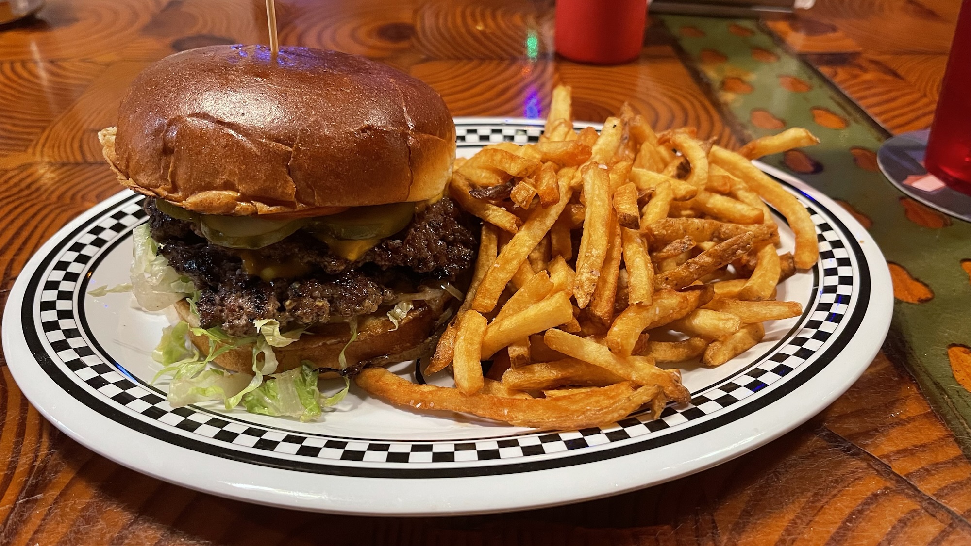 *double cheeseburger (smash burger) with american cheese, caramelized onions, pickles, lettuce, tomato, special sauce, on a brioche bun (served with fries)