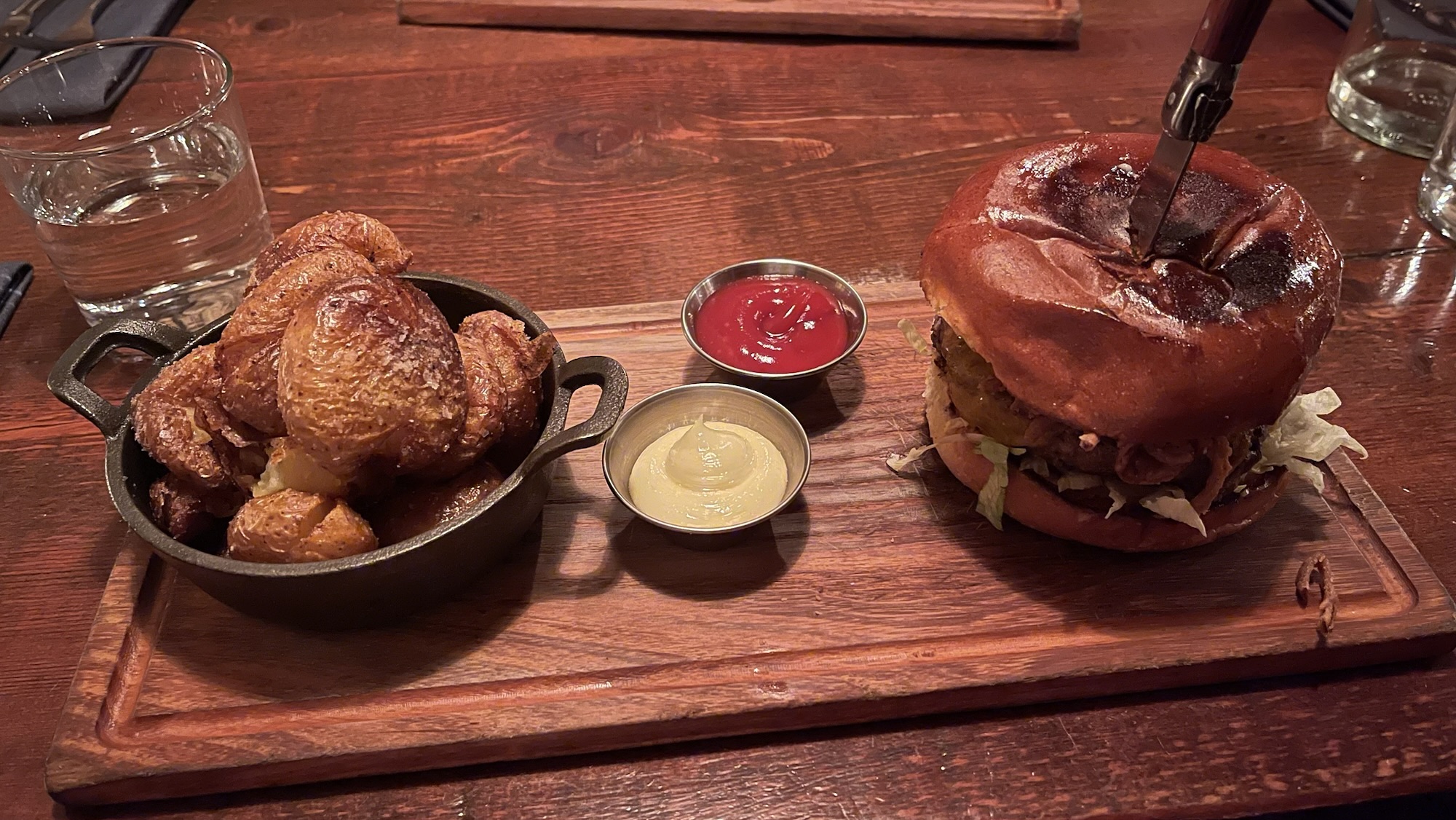 It’s more a traditional-style burger (aka it’s not a smashburger). It’s good quality (you can taste the quality meat). It’s recommended to be cooked medium (which was perfect execution). It could use more fat (it wasn’t very juicy and was much better when you added the garlic aioli and/or ketchup. The cheese was sliced too thin and was practically translucent. If you’re going to put cheese on my burger, I should be able to taste it. The pickles could be more pickle-y (they were nice and crisp and fresh though). The onion strings were nice and crispy. The bun wasn’t too heavy and was toasty perfectly…there was some crunch (in a good way) when biting into the burger. The burger didn’t fall apart and so wasn’t too messy to eat, but it’s definitely a meal. It could probably use more bone marrow aioli to help with the juicy and it’d just be nice to taste it more.