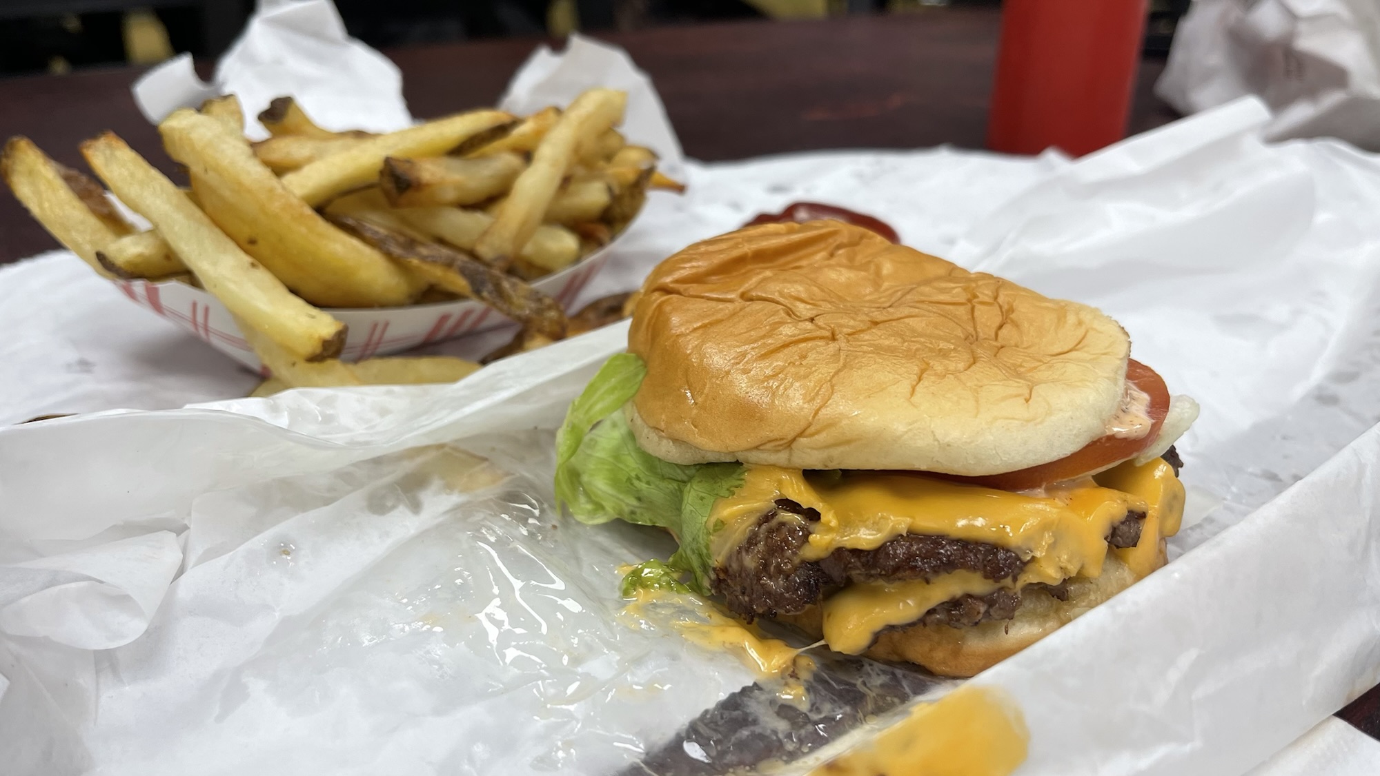 It’s a solid burger. Hit’s the spot on the first bite. The veggies on it are super fresh. They give you a TON of fries (though they don’t salt them). The not so awesome part, it’s actually quite greasy and the wrapper was soaking it all up. It can be a messy eat, but not the fork and knife kind. The secret sacue is pretty good.