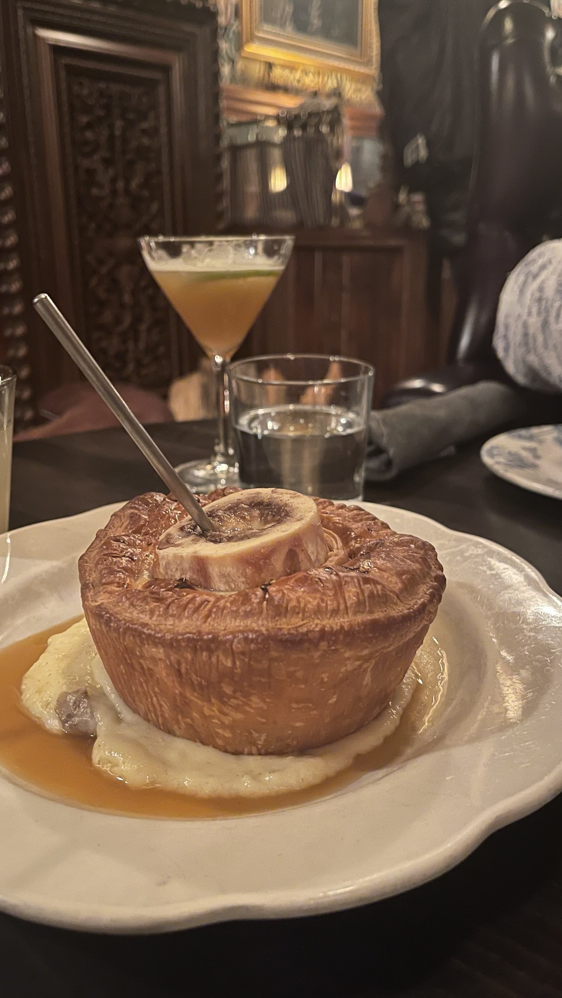 I was set on getting the burger, but upon being told they were British Indian fare and that’s what they excelled at, I was swayed. The samosas also sounded good as did their fish and chips and potpies. It was so hard. They also have really good cocktails. Katie and I each got a cocktail (I got the penicillin). Then we decided it might be in our best interest to split our entrees. She chose the spiced lamb potpie (with bone marrow in the middle – great to eat with the crust). I got the burger (it’s a smash burger).